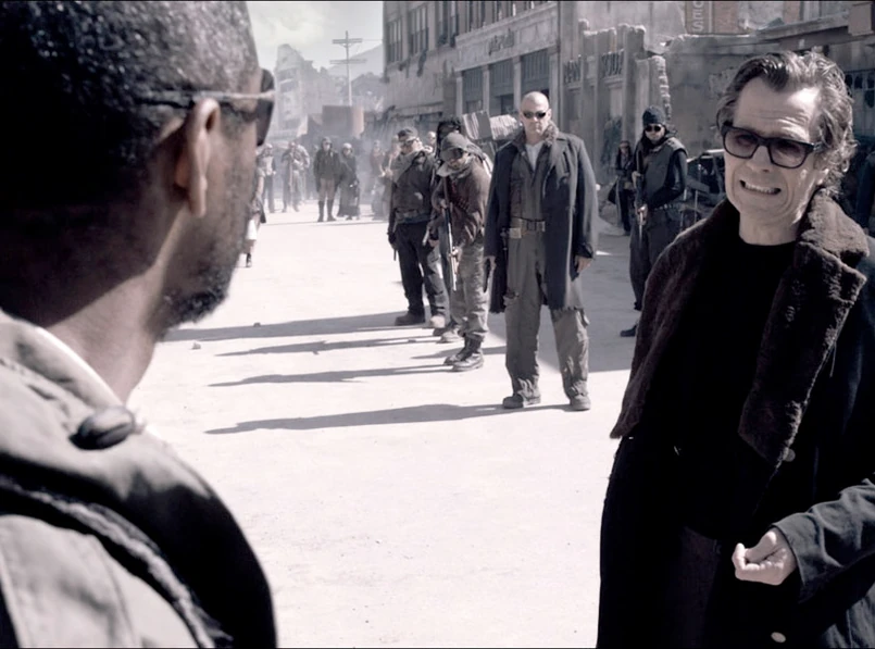 Osią akcji jest poszukiwanie książki, a właściwie Księgi. O wejściu w jej posiadanie marzy lokalny bonzo Carnegie (Gary Oldman), rządzący małym ludzkim stadkiem morderców, grabieżców i gwałcicieli. Tak się interesująco składa, że mityczną Księgę niesie w plecaku świeżo przybyły do osady Wędrowiec (Washington). Ale on, w przeciwieństwie do Carnegiego, który widzi w książce narzędzie władzy, dające niepodzielny rząd dusz, wie, że jego brzmieniem jest ocalenie ludzkości poprzez zawarte w księdze Słowo. A kto na słowo głuchy, temu Denzel obetnie/odstrzeli różne członki, z uszami włącznie. Na szczęście ziarno pada na podatny grunt u niejakiej Solary (Mila Kunis), która wyrusza w dalszą drogę z Wędrowcem, by pomóc mu wypełnić Przeznaczenie. Oczywiście źli ludzie rzucają się w pościg, więc jatka, wybuchy, a nawet kanibalizm pojawią się w kadrze. Na szczęście Ocalenie w osobie białowłosego starca już majaczy na horyzoncie...