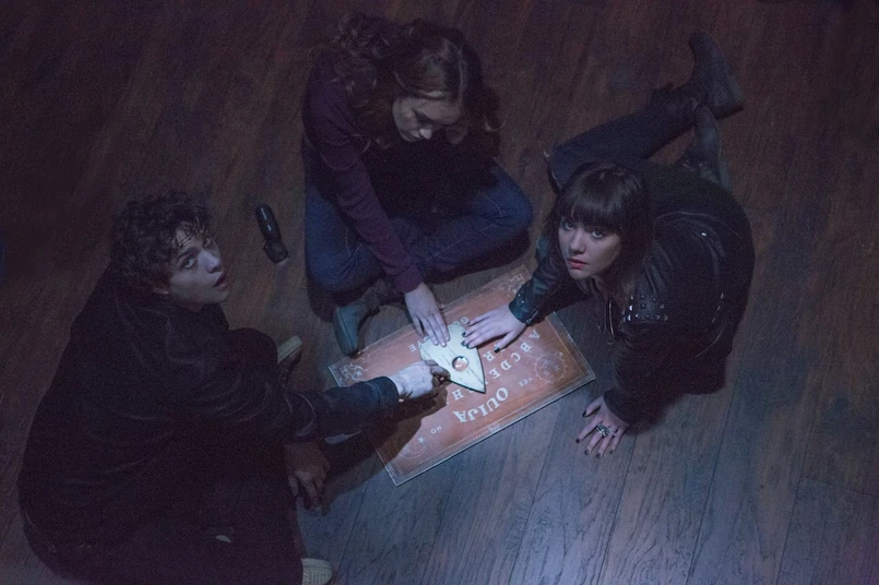Dzieło zainspirowała gra planszowa o takiej samej nazwie. Składa się ona z planszy z literami, cyframi i słowami oraz trójkątnej wskazówki zamocowanej na dwóch rolkach i pionowej igły. Kiedy lekko położy się koniuszki palców na wierzchu wskazówki, ma ona poruszać się nad powierzchnią planszy i wskazywać litery tworzące przekaz. Zwolennicy gry mówią, że dzięki planszy Ouija można komunikować się z duchami zmarłych. Bohaterami filmu są nastolatkowie, którzy opłakują śmierć koleżanki – Debbie (Shelley Henning). Okazuje się, że zgon dziewczyny nie był przypadkowy. Wcześniej również bawiła się planszą Ouija i to ona ją zabiła. W produkcji grają również Olivia Cooke, Daren Kagasoff, Douglas Smith, Bianca Santos i Ana Coto. Film zarobił w trzy dni 20 milionów dolarów.