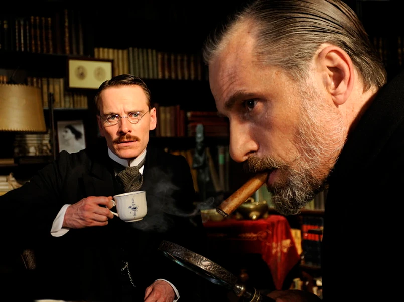 Scenariusz Christophera Hamptona na pierwszy plan wysuwa jednak znajomość Junga i Freuda. Jesteśmy świadkami ich intelektualnych dysput i wymiany listów. Rozmowy ciągną się w nieskończoność, nie wciąga to jednak tak, jak można by się spodziewać po spotkaniu dwóch myślicieli. Ich przyjaźń rozwija się, ale ostatecznie w zależności pomiędzy mistrzem i uczniem pojawia się powątpiewanie Junga, jego chęć wybrania innej drogi w nauce.